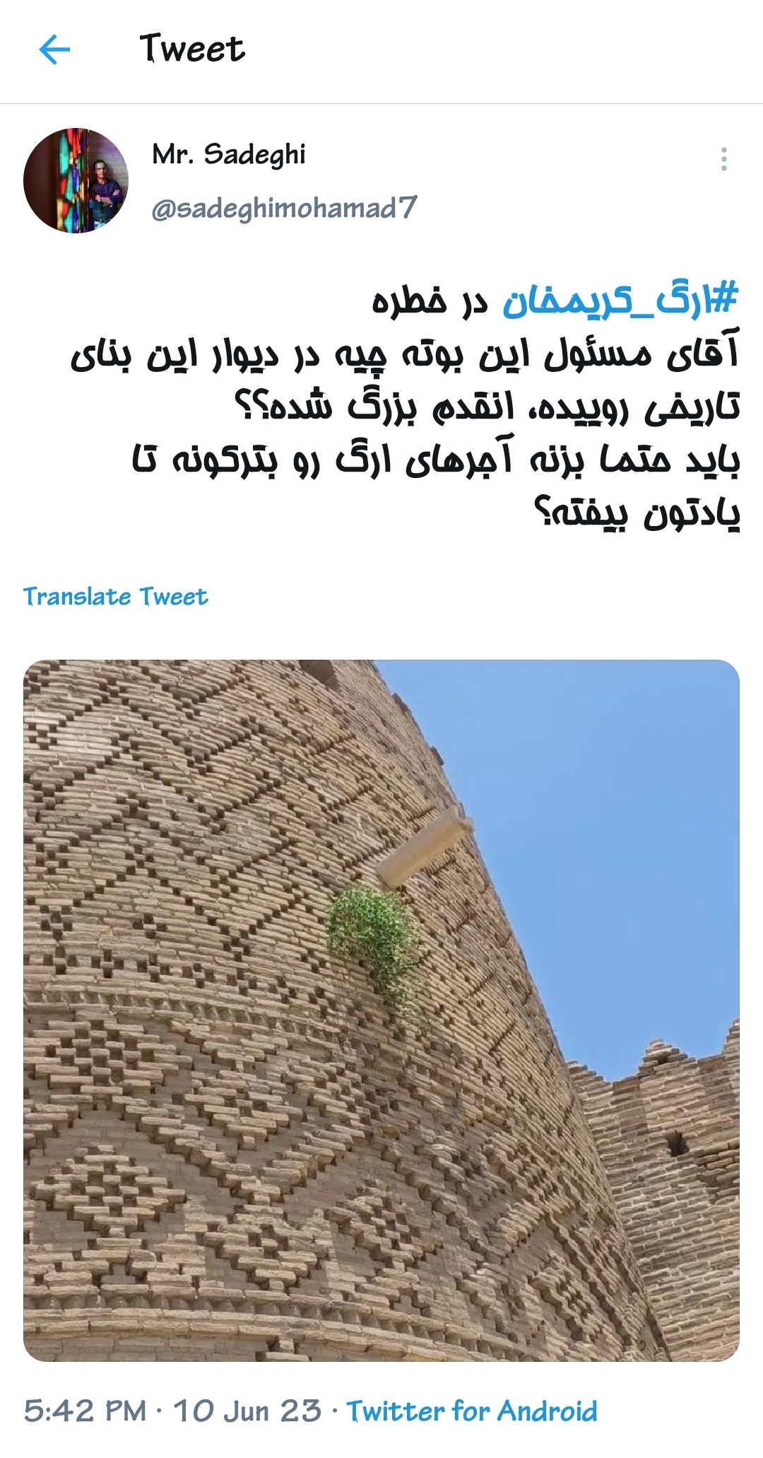 آقای مسئول این بوته چیه در دیوار این بنای تاریخی روییده، انقدم بزرگ شده؟؟باید حتما بزنه آجرهای ارگ رو بترکونه تا یادتون بیفته؟»
